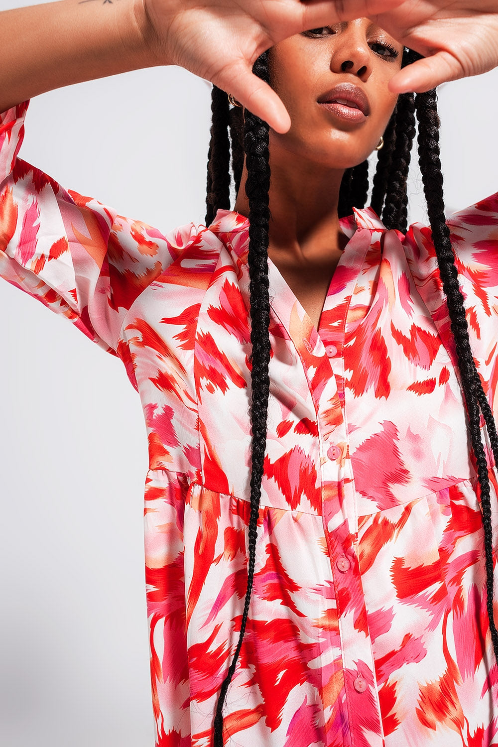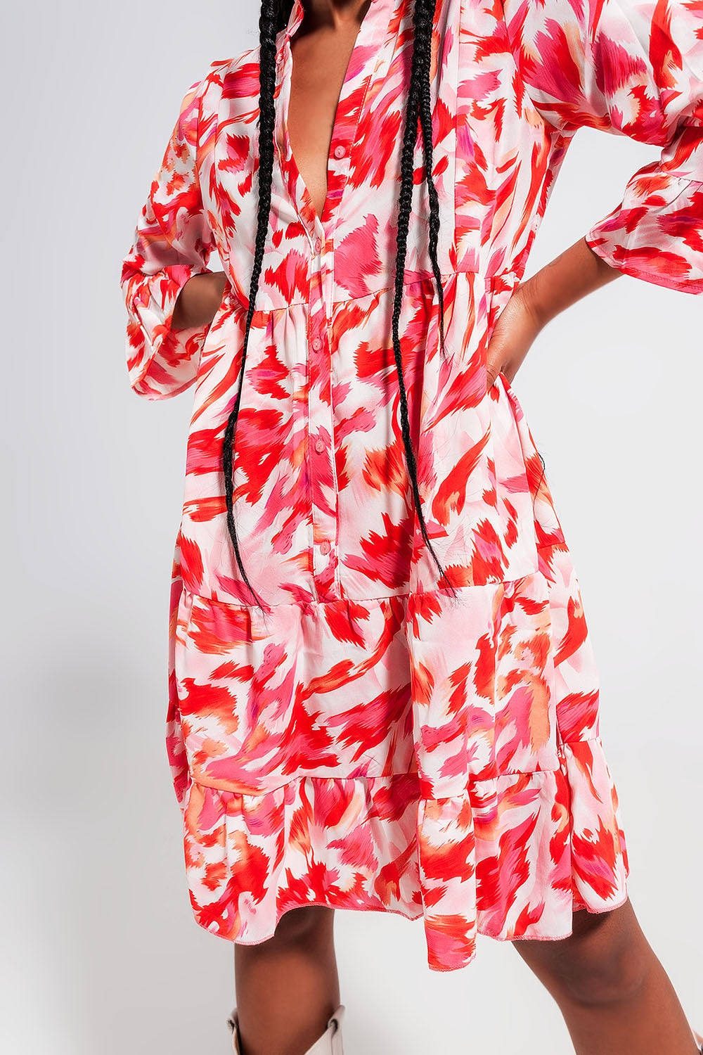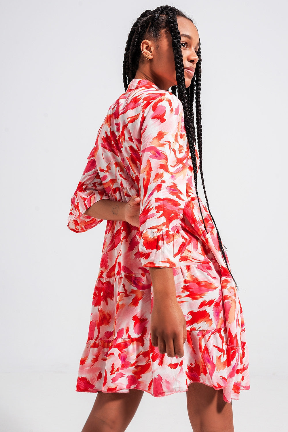 V-neck dress with 3/4 length sleeves. Abstract print with a relaxed style & comfy fit. Lightweight woven fabric. Tiered skirt. runs true to size.